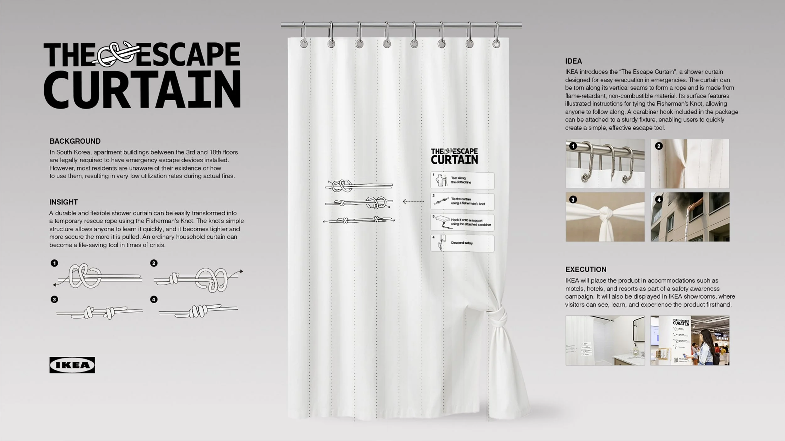 In South Korea, evacuation devices are legally required in mid-rise apartments, yet real usage during fires remains low due to lack of knowledge. IKEA proposes the “Escape Curtain”, a flame-retardant shower curtain that can be torn into rope, includes visual knot-tying guidance, and uses a built-in carabiner for emergency descent. It will be placed in lodging facilities and showcased in stores to prove that everyday design can function as a life-saving tool.